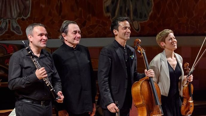 A classical chamber concert at Muziekgebouw aan 't IJ featuring Faust, Widmann, Queyras, and Aimard performing Berg, Carter, Messiaen, and Ravel.