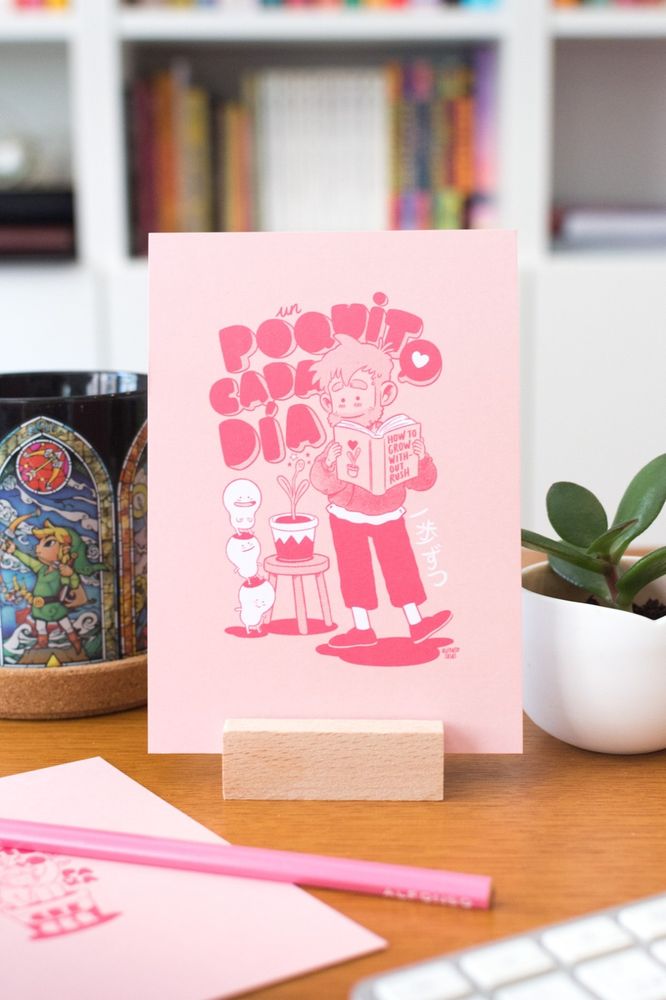 He hecho un set de 7postales con estos dibujos que fueron una manera de salir de mi bloqueo creativo y que ahora veo como un homenaje/recordatorio a la vida sin prisa. La primera tirada trae de REGALO un soporte de madera para ponerlas como en las fotos.La tenéis en