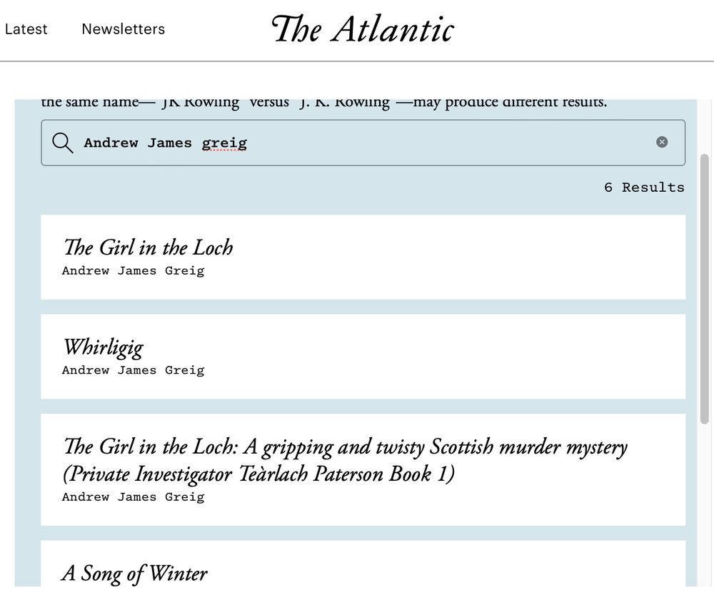 Screenshot of crime fiction charts. Two books by Andrew James Greig along with Stephen King, Lee Child, Arthur Conan Doyle and Val McDermid