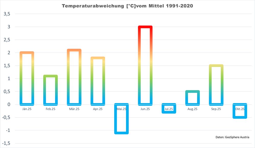 damit haben wir heuer bisher 7 warme Monate und 3 unterkühlte. In Summe liegt das heurige Jahr bisher um genau +1 Grad über dem Schnitt der aktuellen Klimanormalperiode (1991-2020).