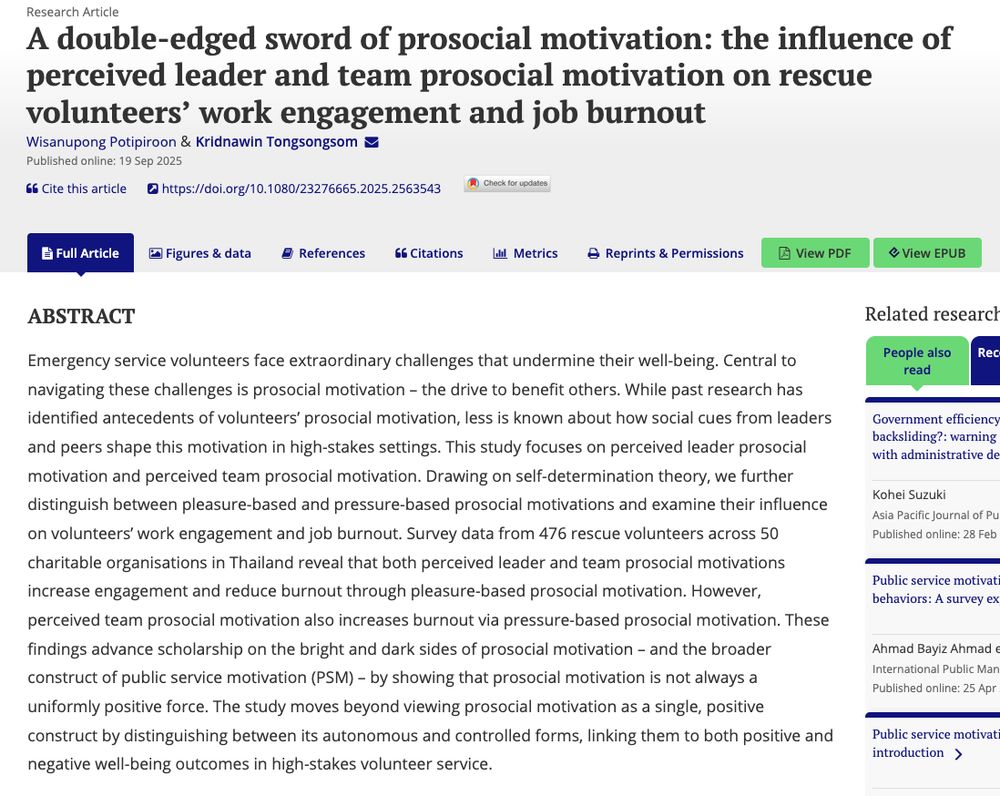 Hot off the press! Potipiroon & Tongsongsom draw on #self-determination theory to distinguish between pleasure-based & pressure-based prosocial motivations & examine their influence on volunteers’ work engagement & burnout www.tandfonline.com/doi/full/10....