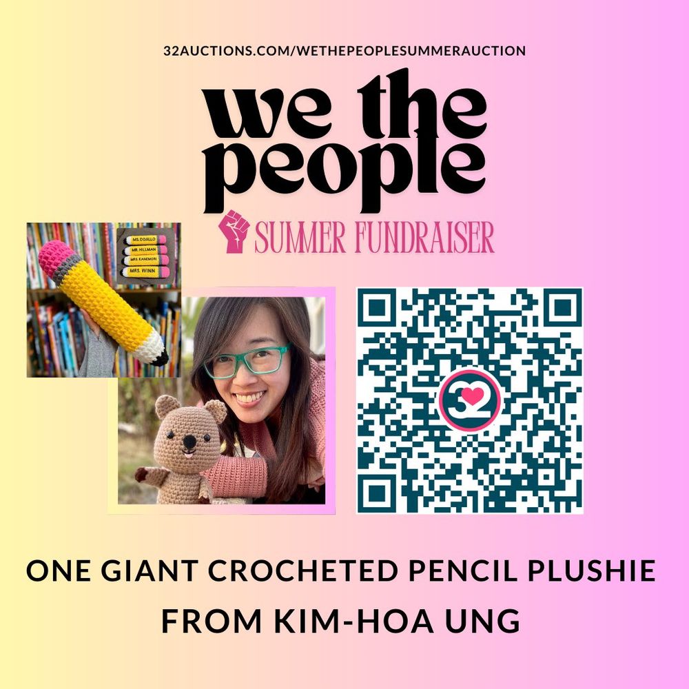 A pink-and-yellow graphic featuring a picture of me and a QR code to the 32auctions.com site to bid!