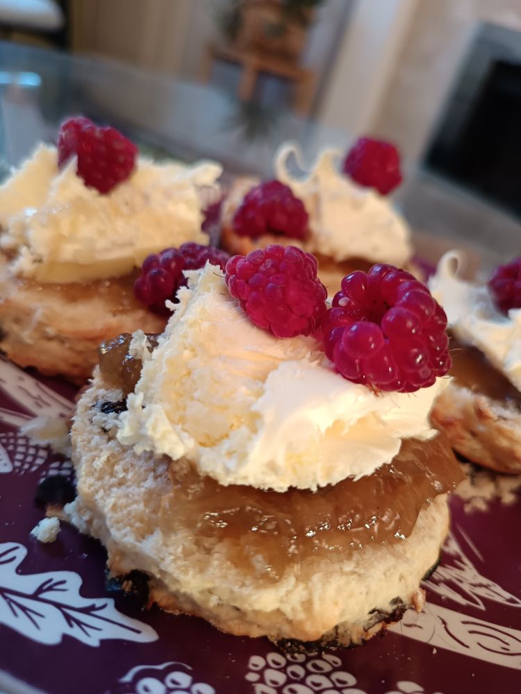 #Homebaked sultana scones with my Made By Justine rhubarb & ginger jam, clotted cream & #homegrown raspberries😋 #eastyorkshire
