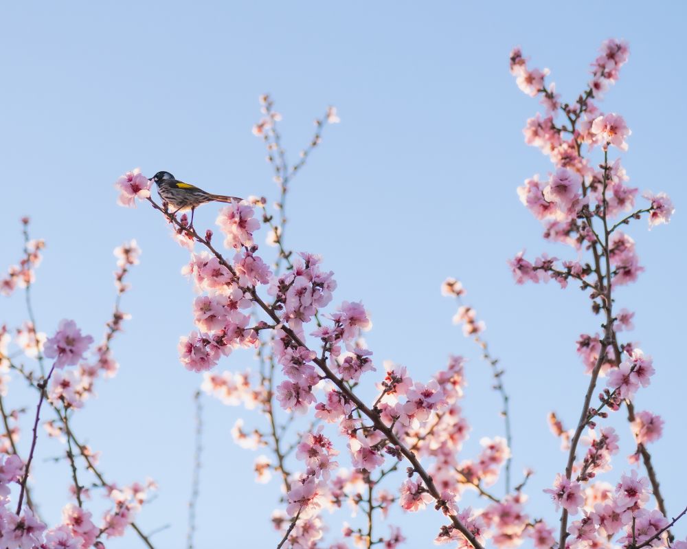 New holland honeyeater sitting amongst the blossoms on a tree down the street from home, seems like a nice sign that spring is here and its going to stop being so freezing every night