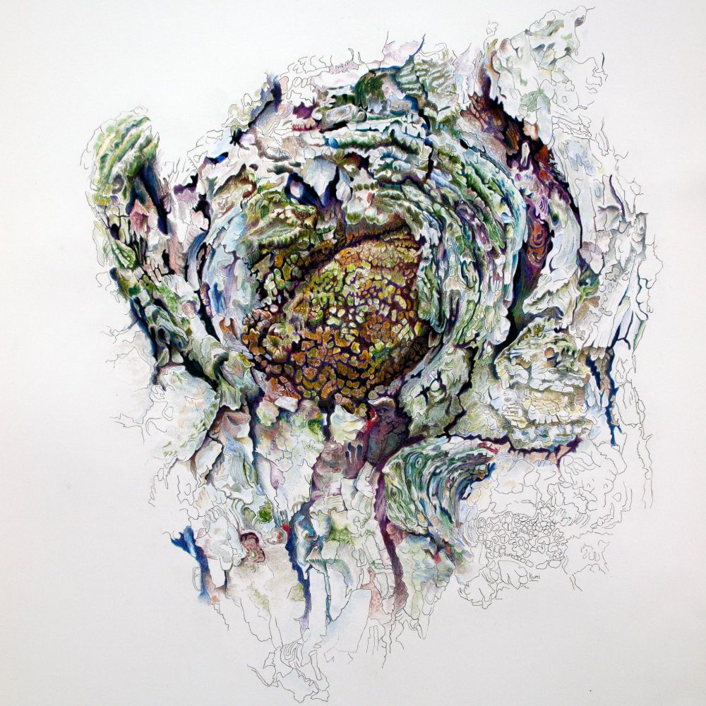 Sitka Spruce Surreal, 10x10x1.5" colour pencil, ink on cradled panel. What is just beyond the reach of the human eye captivates me artistically and with colour pencils, allows me to come closer to reality than with any other art medium. #sitkaspruce #treebark #colourpencil #drawing #art