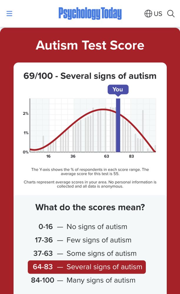 Not an official assessment, bc getting one of those can be very difficult & a lengthy process esp for adults. I’ve taken a lot of online surveys from different sources. A doctor friend who runs a social services agency for neurodivergent ppl told me self-diagnosis is well accepted because of that