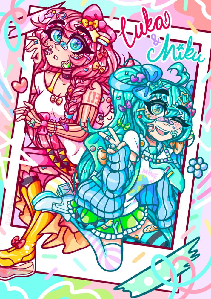 🎀🩹I drew Miku and Luka in decora for the Galasynth zine a little while ago!