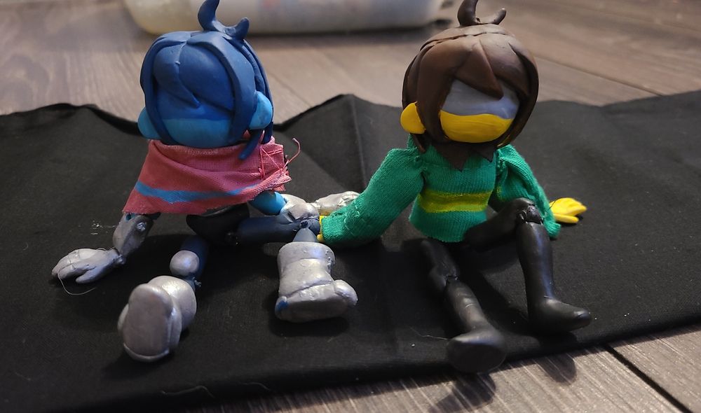 Kris puppets I made for me and my sisters birthday. They really didnt want to become puppets as the process of making them was awful. I keep the dark world Kris since I'm going back to college in a different city and she gets the hometown one because she's studying there. :D #deltarune