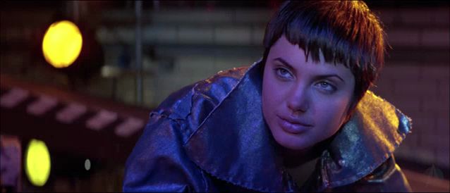 Alt: Angelina Jolie as Acid Burn in the movie Hackers (1995) with short hair, sitting atop a motorcycle, wearing an iridescent blurple jacket, suggestively raising her immaculately manicured eyebrows towards someone off camera.