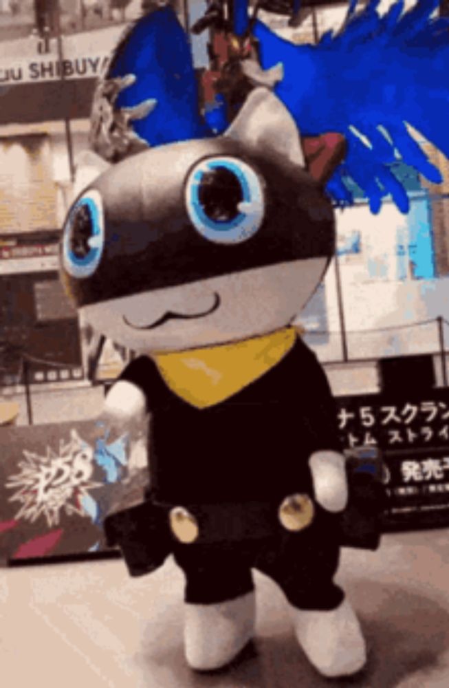 ALT: a mascot is standing in front of a building that says shibuya