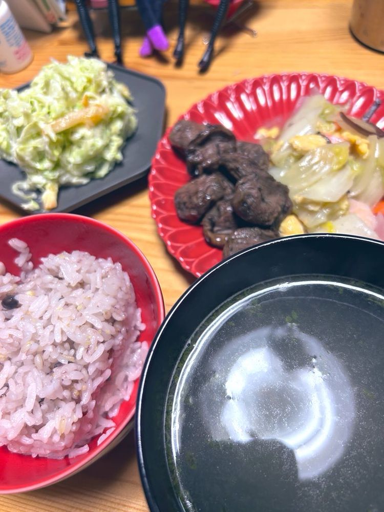 ‎あと、お野菜たっぷり味噌汁で……どうだ?とお伺いを立ててみたら、まだ炭水化物は足りねぇ!ということだったので、小餅を焼いて味噌汁に入れました