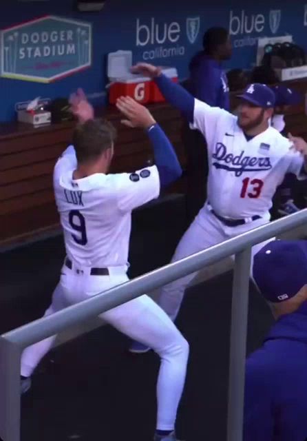 ALT: a dodgers player high fives another player in a blue and white uniform