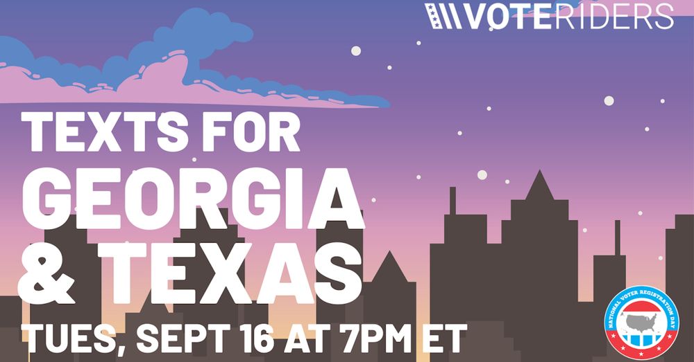 Join VoteRiders on National Voter Registration Day, Tuesday, September 16th at 7:00PM ET for a power hour of sending text messages to at-risk Georgia & Texas!