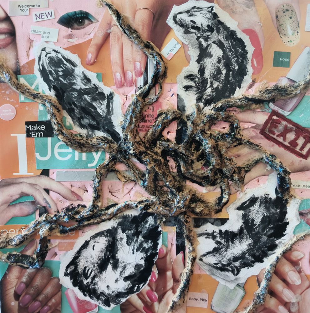 A glossy surface torn apart- rats, glitter, and scratched-out exits. This piece blurs beauty with infestation, asking if the promise of escape is real or just another trap.