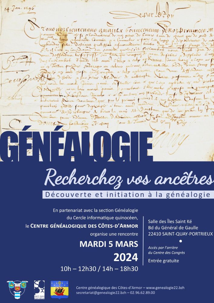 Le samedi 1er février 2025, de 10h à 17h, le Centre Généalogique des Côtes-d'Armor, en partenariat avec la Mairie de Pontrieux et l'association Racines et...