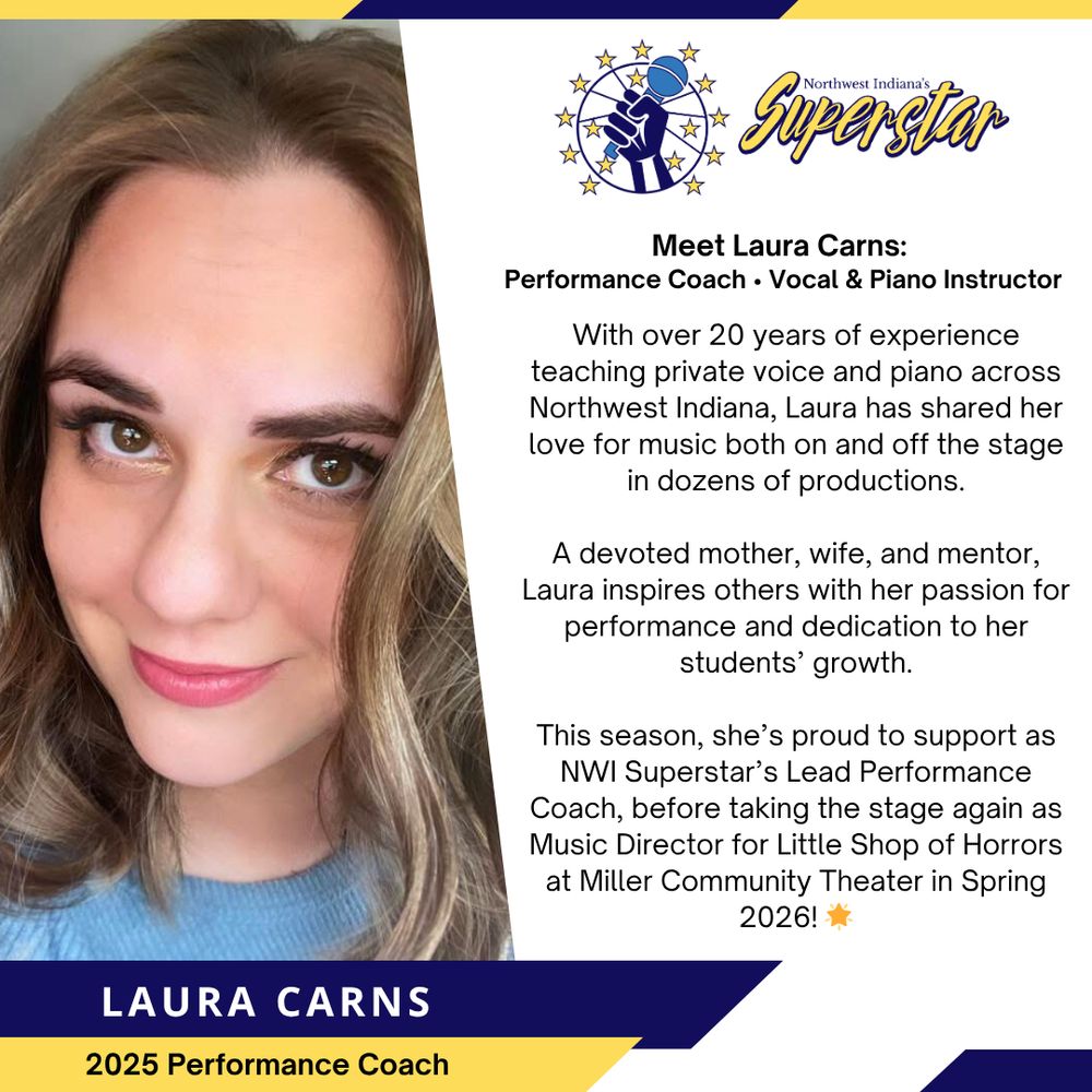 🎵 Meet Lead Coach Laura Carns! With 20+ years teaching piano & voice in NWI, Laura’s led dozens of theatre productions & inspired countless performers. 🌟