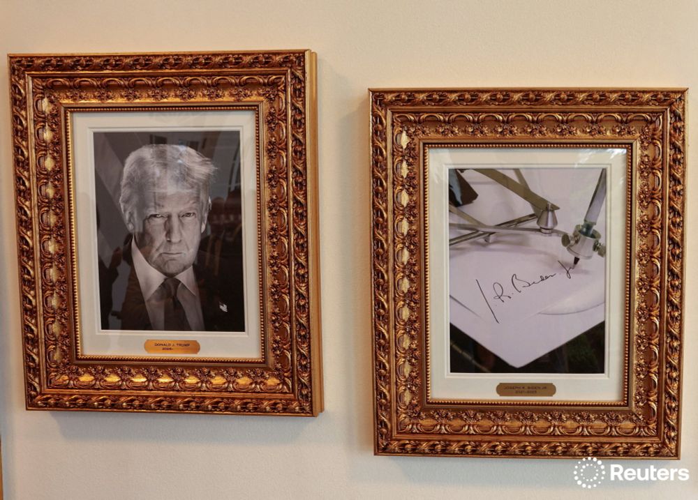 An image of an autopen signing former President Joe Biden's signature is displayed in place of a portrait of Biden next to a portrait of President Donald Trump at the "Presidential Walk of Fame" at the White House in Washington reut.rs/46FhSrg 📷 Kevin Lamarque