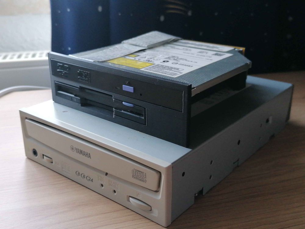 I finished a part for a project I'm working on. Basically, I needed an optical and floppy drive but full-sized ones are way too big. So I took laptop versions of these parts and made a frame to mount them in, with adapters to attach the drives to regular PC motherboard.