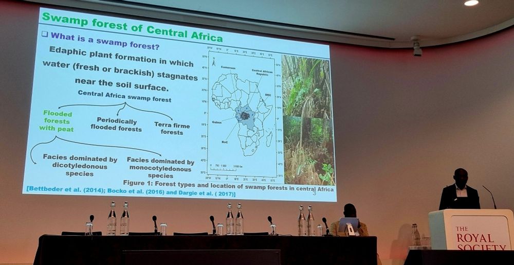 Yannick Bocko starts the second day of our African Peatlands science meeting at the @royalsociety.org with a presentation on the diversity of Congo peatland vegetation biomass - the machinery driving peat accumulation in this carbon-dense ecosystem @congopeat.bsky.social