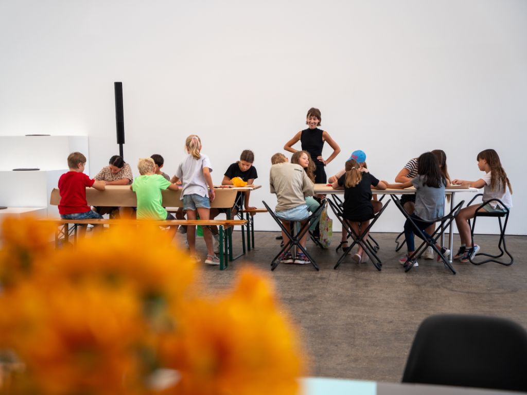 Kids explore language and perception during a spring holiday programme at Kunsthaus Baselland. In dialogue with Eva Lootz’s current exhibition, they discover how the invisible can be expressed and how quiet voices carry meaning. They then design, write, and fold their own paper artworks under the guidance of Eva Grüninger and Enya Bains.