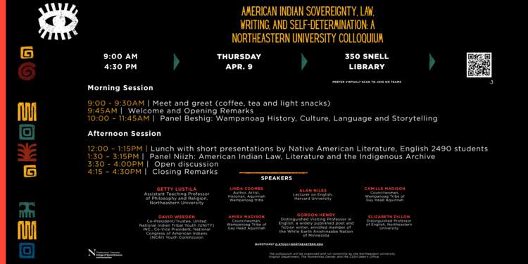A one-day hybrid colloquium at Northeastern University with two panels on American Indian law, writing, sovereignty, and self-determination. Wampanoag speakers from Mashpee and Aquinnah discuss language, storytelling and culture, followed by literary-archival discussions across writing and history.