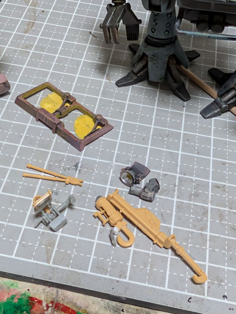 1/100 クラブタイプ、相変わらずちまちまやっています。あとは本体の頭頂部と、左右にいくつかフックを付け、荷台の接続部分を作るなどすれば概ね工作は終わります。頭の機関銃は本当は何か他のものにしたいんですが思いつかなくてとりあえず付けてます。せめて片側だけでも他の何かを付けたいんですよ。自分のウォーカーマシンは『戦闘メカ』にはしたくない気がしてまして。