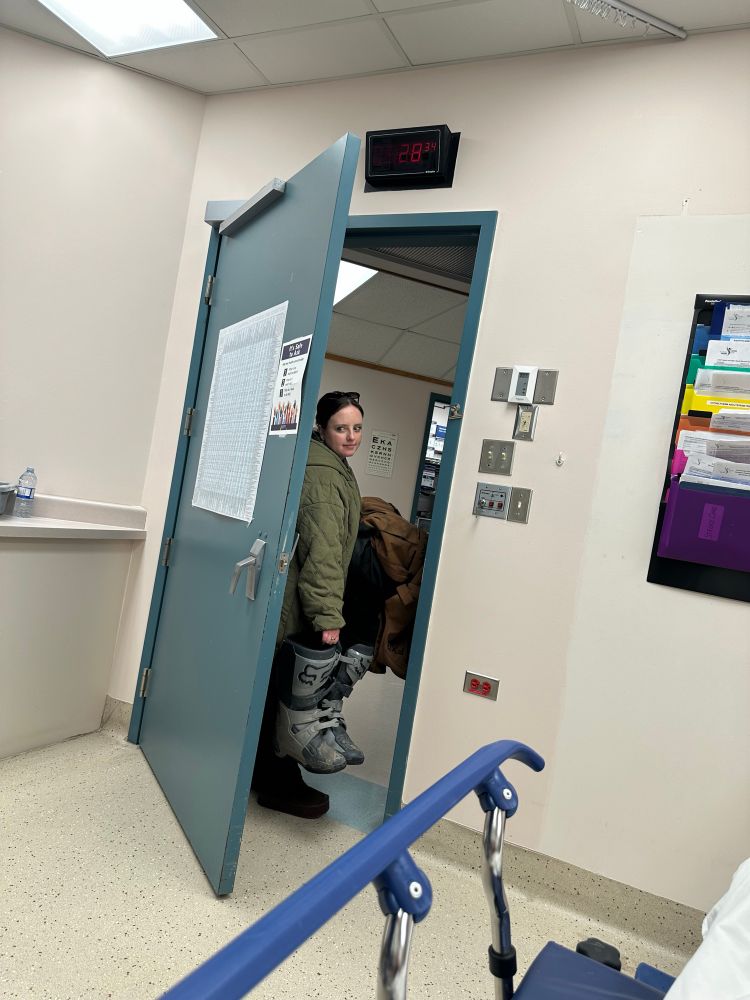 The innocent crash that has me taken out with a bad knee injury… waiting for an mri appointment to asses soft tissue damages. Today knee is all purple 😢 what bothers me is I wasn’t wearing my knee braces as I felt they were to bulky under my snow suit 🤦‍♂️