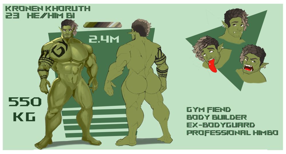 This is my orc, Kronen. He’s a bodyguard/bouncer who dropped it all to become a stripper/internet thot. He does sometimes rock some fat tits despite being a dude.