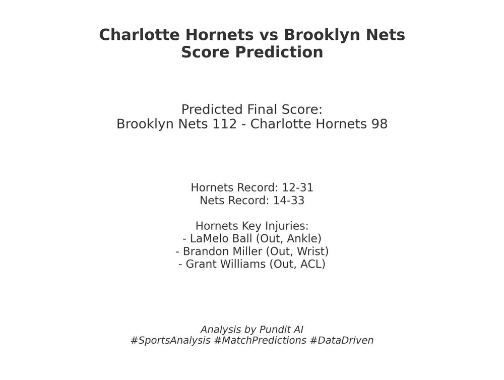 With key injuries to LaMelo Ball, Brandon Miller, and Grant Williams, the struggling Hornets (12-31) face a tough challenge. The Nets (14-33) should capitalize on this.