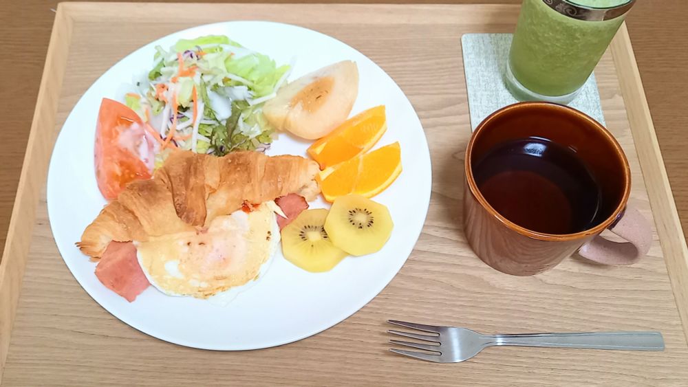 昨日パン屋さんで購入したクロックムッシュ、梨、カフェオレ。