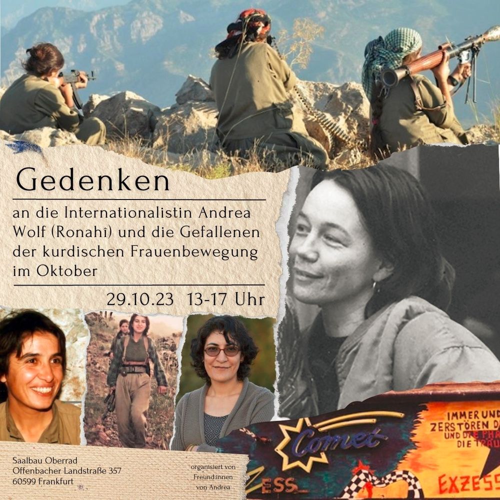 Gedenken an die Revolutionärin Andrea Wolf - Ronahî Am 23. Oktober 1998 wurde sie vom türkischen Militär mit weiteren Genoss:innen extralegal hingerichtet. In Frankfurt findet eine Gedenkveranstaltung statt. Eingeladen sind diejenigen, die sich mit ihrem Kampf verbunden fühlen.