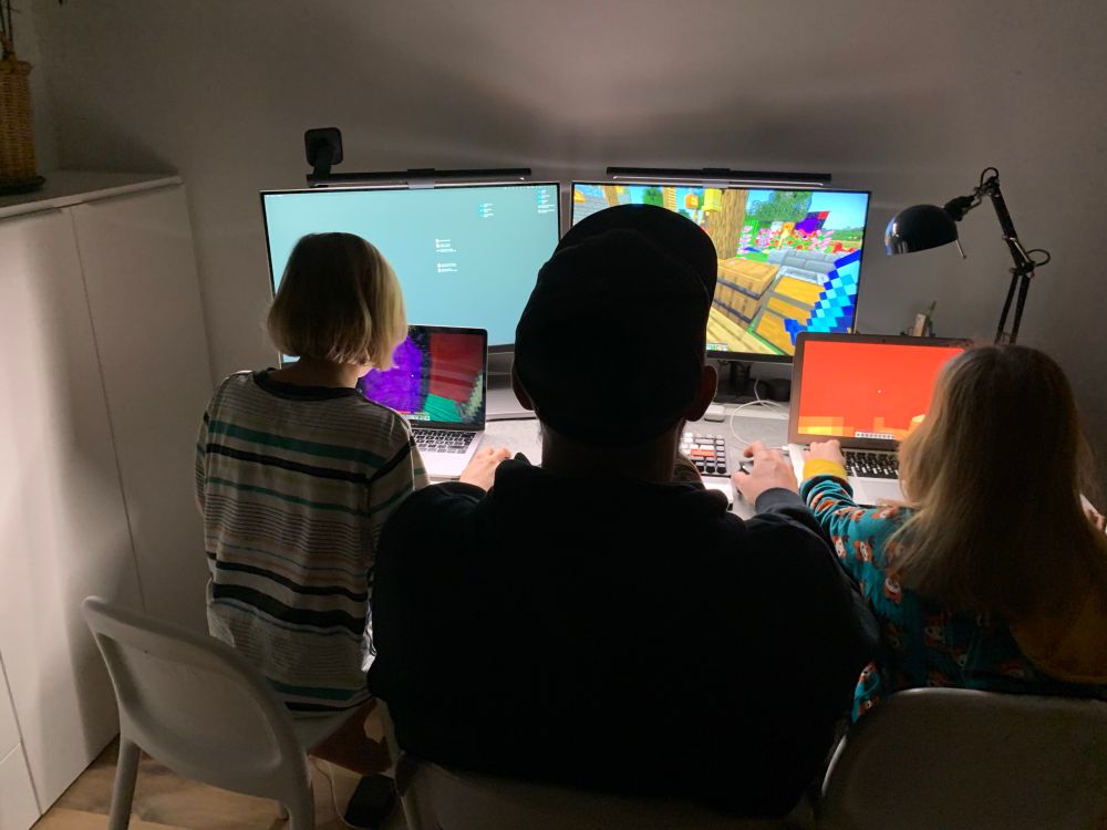 Die mitspielenden/zuguckenden Kinder waren da 9, 7 und 4 (Minecraft, eigene Umgebung).