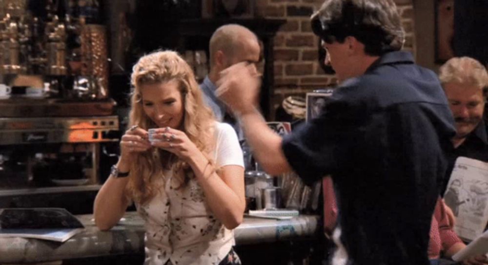 Alt: a woman sitting at a bar drinking from a cup and a man steals her cup and drinks from it