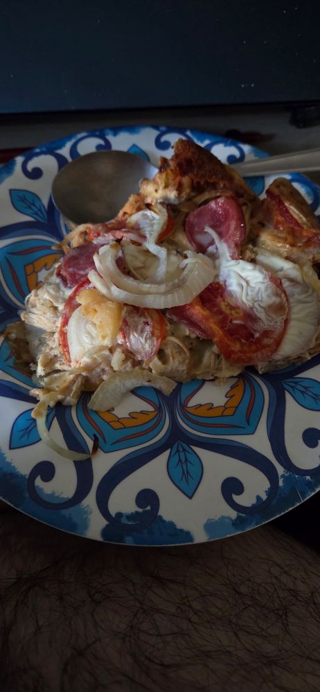 Fiz a pizza com massa de batata e é uma delícia mesmo. Desmancha toda, tadinha, mas vale