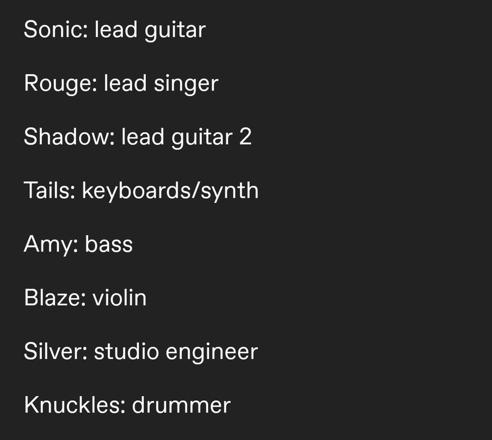 an AU based on 2000s rock where the #sonic characters have no powers and are part of a touring band! fic out soon!! DESIGNS ON REPLIES IN THIS THREAD...