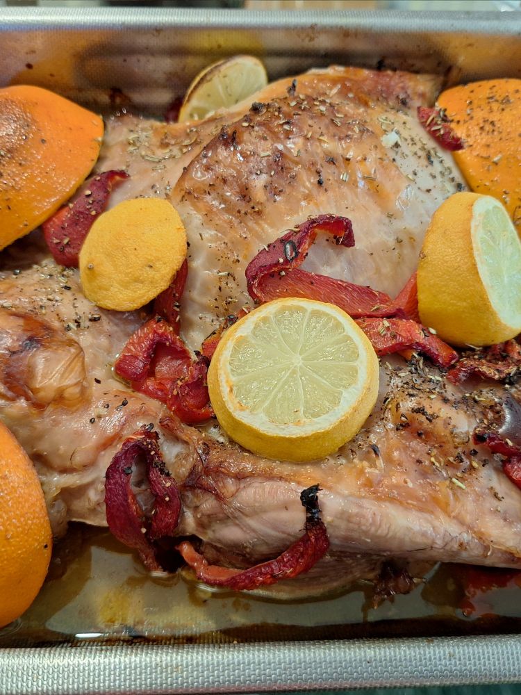 Perna de peru desossada no forno com citrinos.
