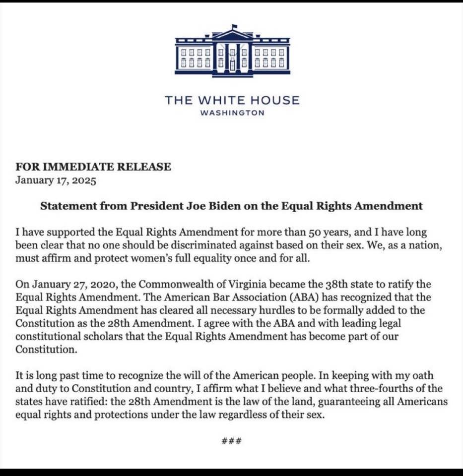 The 38th Amendment to the Constitution has been signed by President Biden & has become part of the Law of the Land.