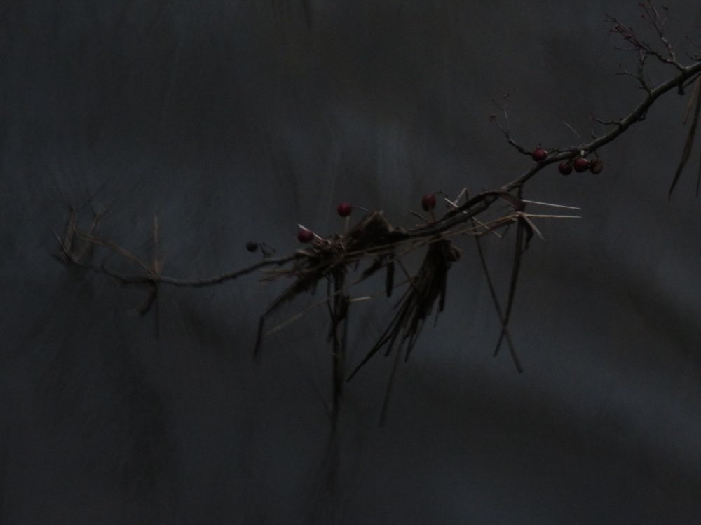 & through the riverfield (its strange flat line of stones punctuated by hawthorn), soft & waning deepautumn, squeaking of long tailed tits & buzzard issuing key from nearbare larch, wheeting nuthatch deep in cover