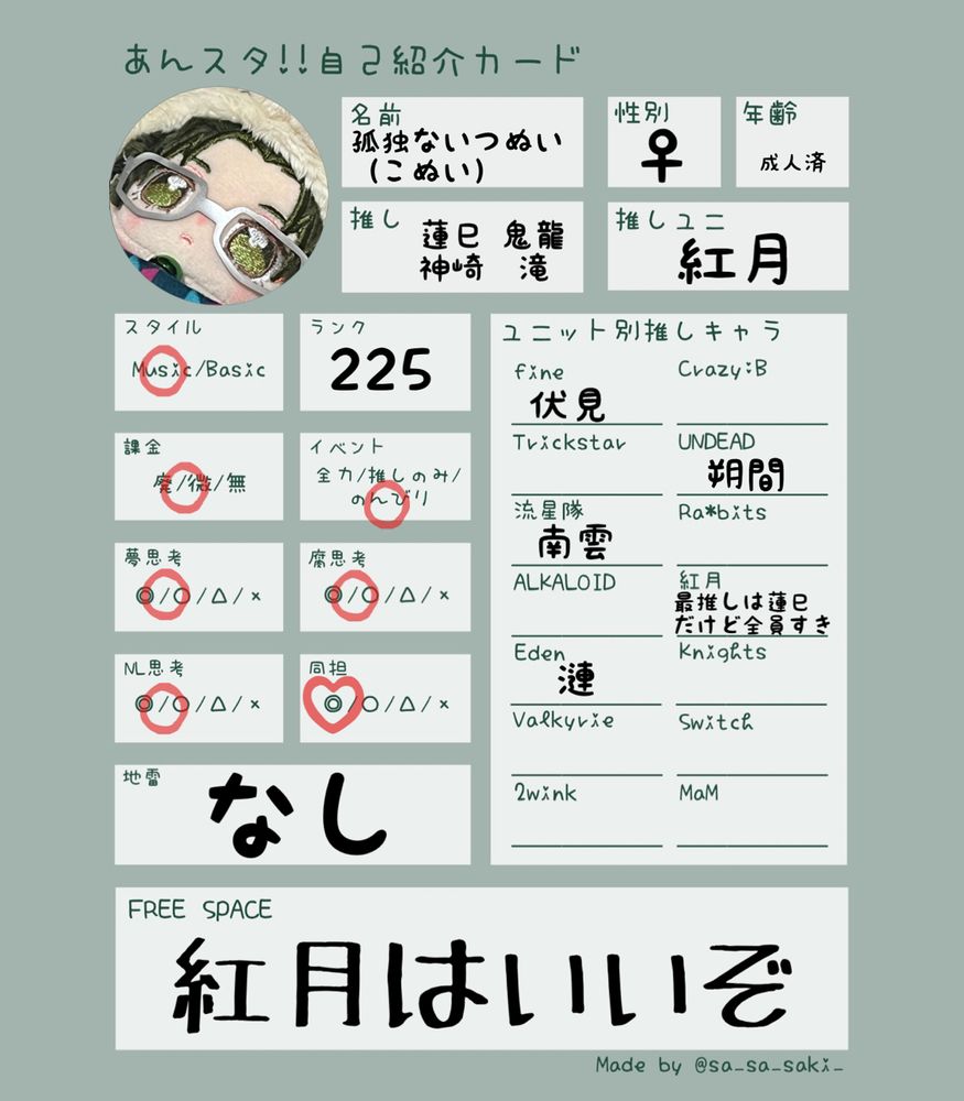 3人でも4人でも紅月が大好き/長文でよく喋る/MVとか衣装、歌詞の感想をよく話す/アイドルを邪な気持ちでみることがある/ネタバレをすることがある/いつぬいの世話はたまにする/小説が好き/本の会社ではたらいている/読んだ小説の感想も話す/急にフォローして申し訳ない