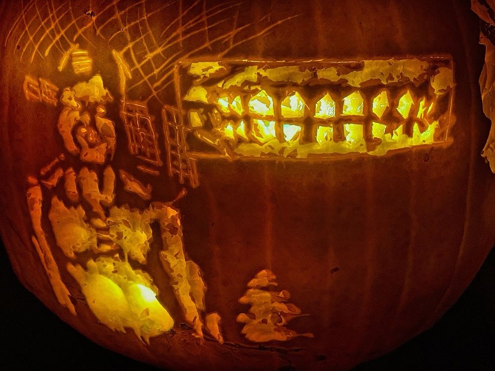 #noimnotahuman , I’m a pumpkin. #pumpkin no.4 of #halloween2025 is this guy from a game by @trioskaz.bsky.social . He looks cold, do you think I should let him in? #pumpkins #pumpkincarving #pumpkinlantern #halloween #happyhalloween #jackolantern