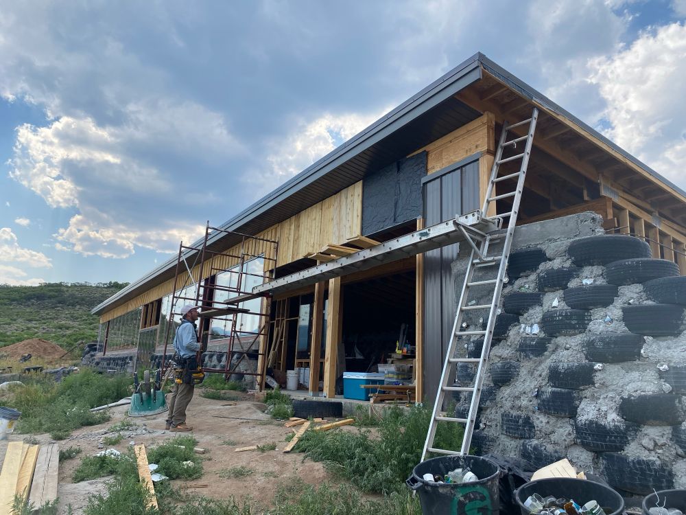 An Earthship, seen here is an affordable, DIY home built out of recycled waste, mostly tires that is 100% off grid and wind / fire resistant.