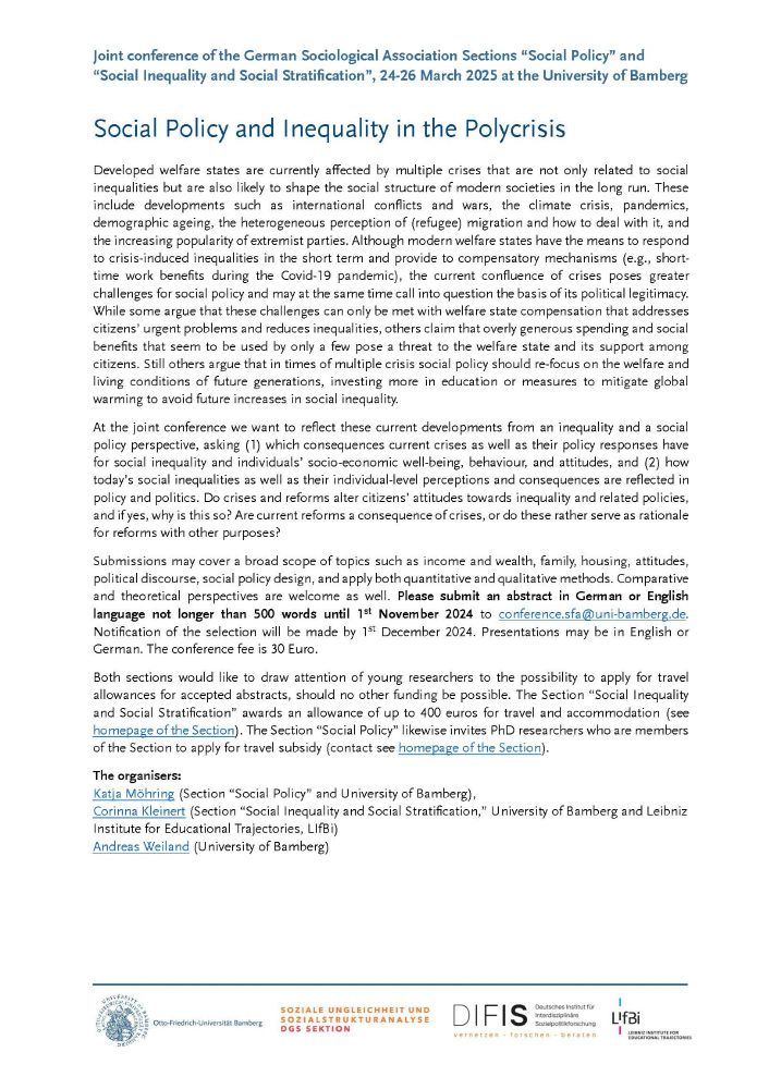 We invite you to submit your abstracts for the joint conference of the German Sociological Association Sections “Social Policy” and “Social Inequality and Social Stratification”, 24-26.03.2025 at the University of Bamberg. More info in the call