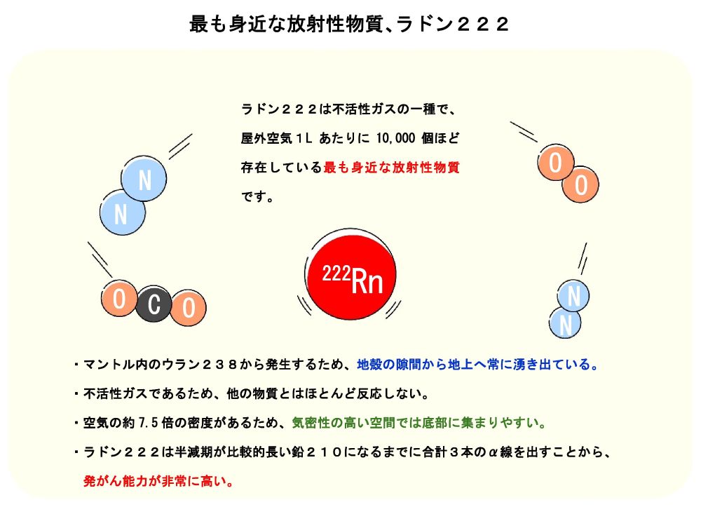地中深くのマントル内のウランを由来に常に生成されていることから、地上の空気にはどこでも普通に含まれている「目に見えない最も身近な放射性物質」と言えます。