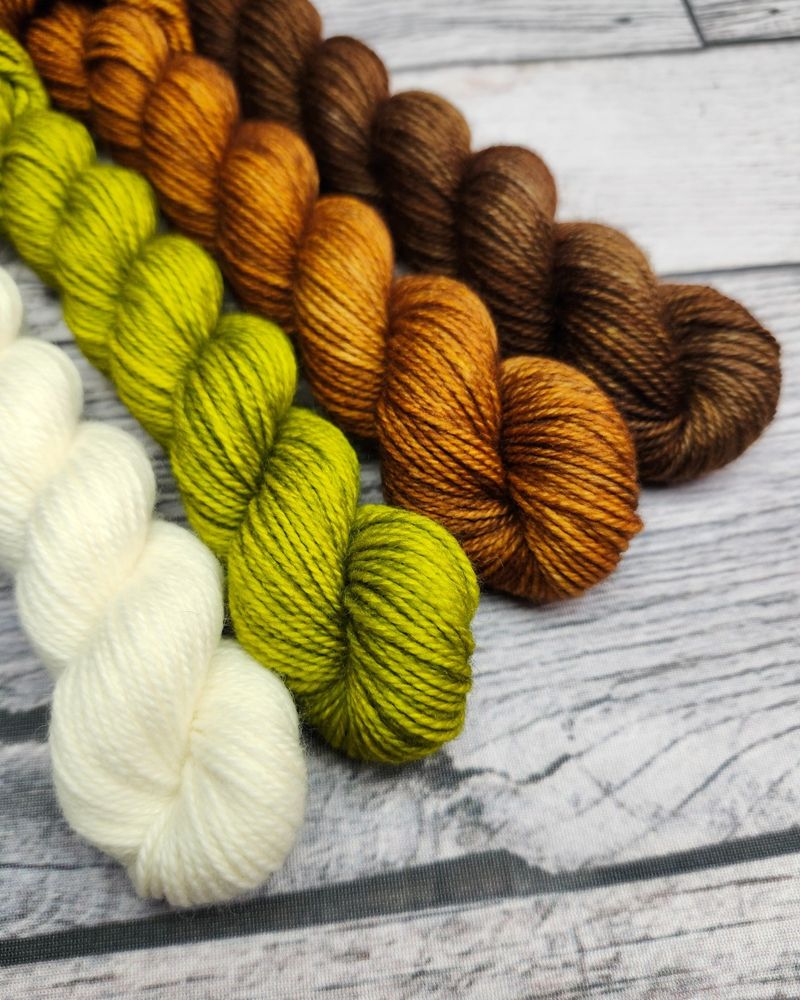 Mischief & Moss is the March colourway set for the Year of Gnomes and it is now available for purchase. The colours in this yarn 🧶 set from left to right are "Find a Penny", "Free Spirit", "Kristie's Green", and "Clove Bud." I'm trying to decide on a March gnome to #knit. Which one are you doing?