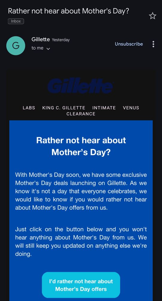 Mother's Day is not happy time for all & brands increasingly acknowledge this in email marketing. Give people chance to opt out of Costco Mother's Day emails to avoid unhappy customers & show you care about Mother's Day marketing empathy & sensitivity.
