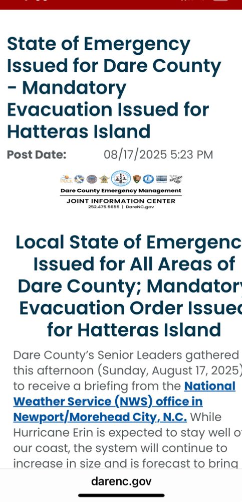 Mandatory #Evacuation issued for Hatteras Island. Dare County has 2 evacuation routes:
