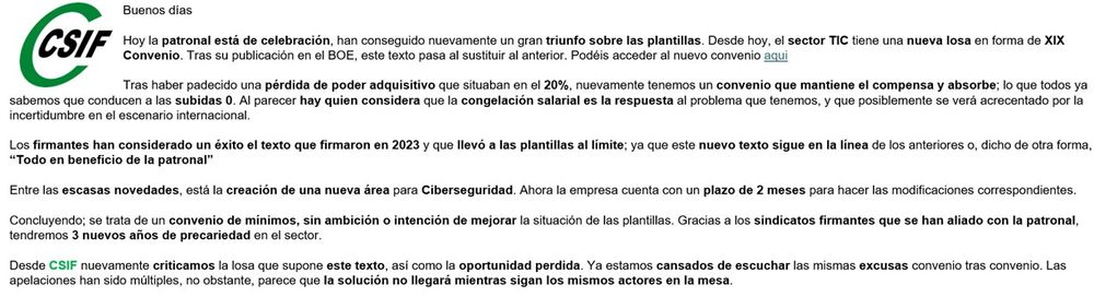 La publicación del #convenioTic confirma la #precarización y #CongelaciónSalarial en el sector tic por los próximos 3 años