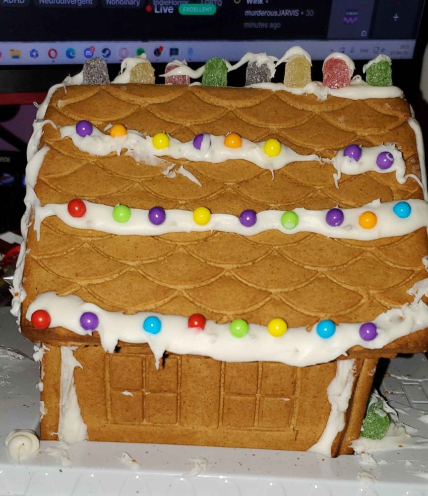I put together a gingerbread house yesterday, during my #Twitch stream. It was my first time making a gingerbread house and I severely underestimated how messy it would be. xD This was the end result. Oh and the one roof side was already broke when I took it out the box.