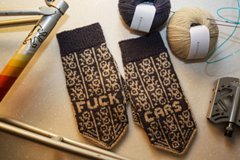 "Fuck Cars" Mittens pattern by Erin Megenity