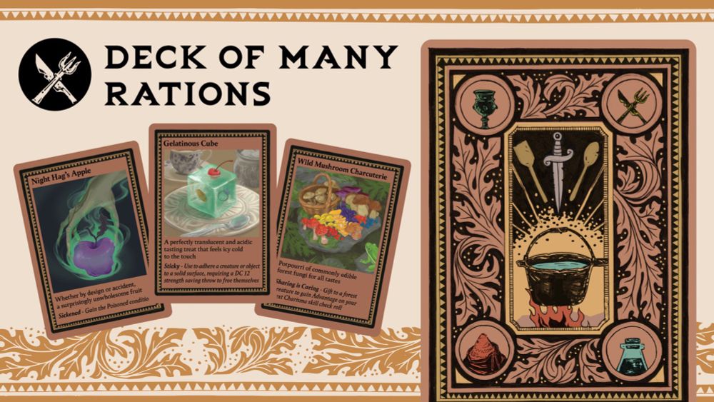 Feeling a bit peckish in the dungeon? The Deck of Many Rations has something delicious for you! Fun concept to add some flavor to rations. I really dig the art, so I added the stickers option to my pledge. #DnD #TTRPG